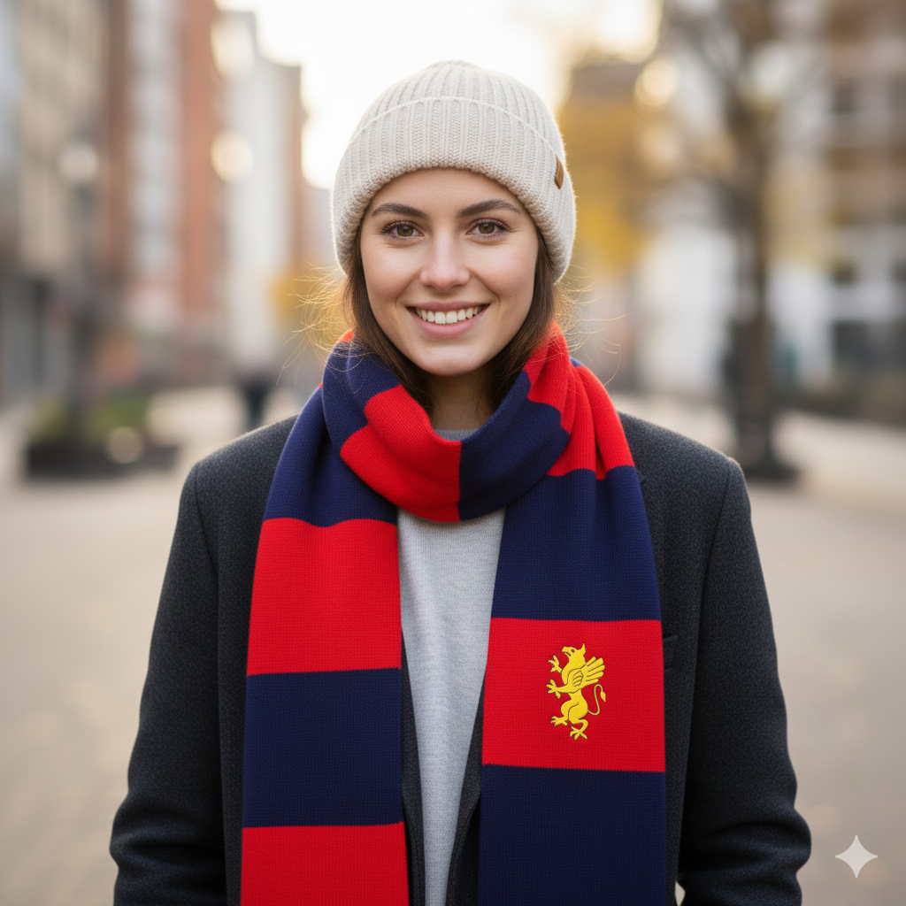 Sciarpa in tessuto pregiato dai colori rossoblu' caratteristici, impreziosita da un delicato ricamo che ne esalta l'eleganza. Perfetta per aggiungere un tocco di stile sofisticato a qualsiasi outfit, questa sciarpa combina tradizione e raffinatezza. Ideale sia per occasioni formali che per l'uso quotidiano, garantisce comfort e versatilità. Un accessorio essenziale che riflette gusto e personalità di chi la indossa.